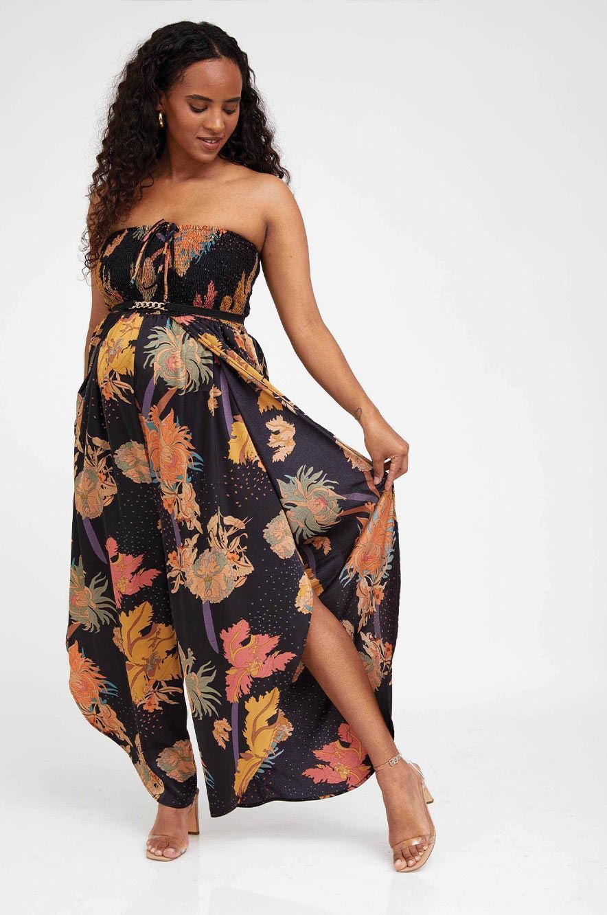 אוברול הריון אלגנטי מבד דמוי סאטן בהדפס פרחוני אוריינטלי משגע.