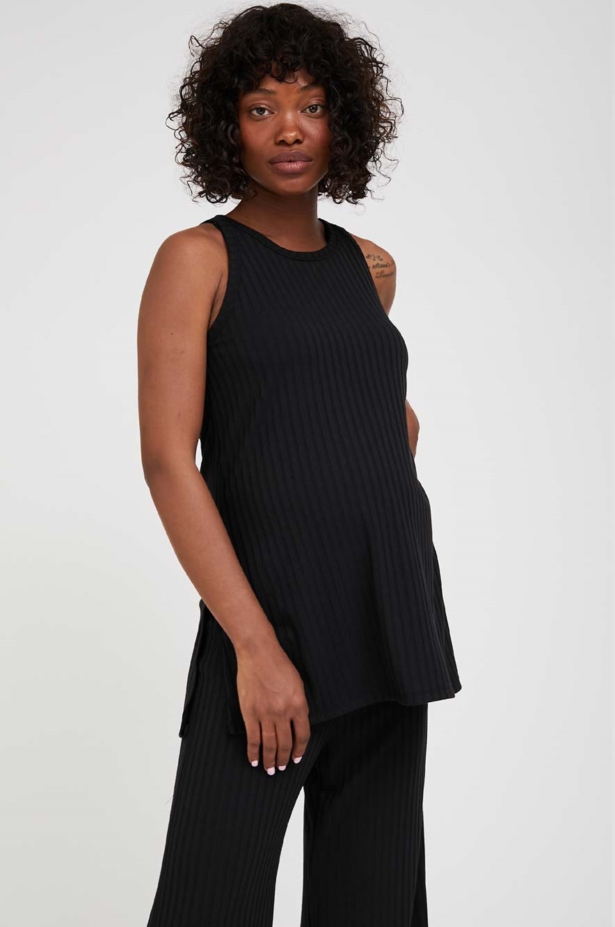 גופייה להריון נעימה עשויה מבד נשפך בטקסטורת פסים בגזרה ארוכה עם צאוורון עגול סגור ושני שסעים בצידי הגופייה. מושלמת לקיץ הקרוב.