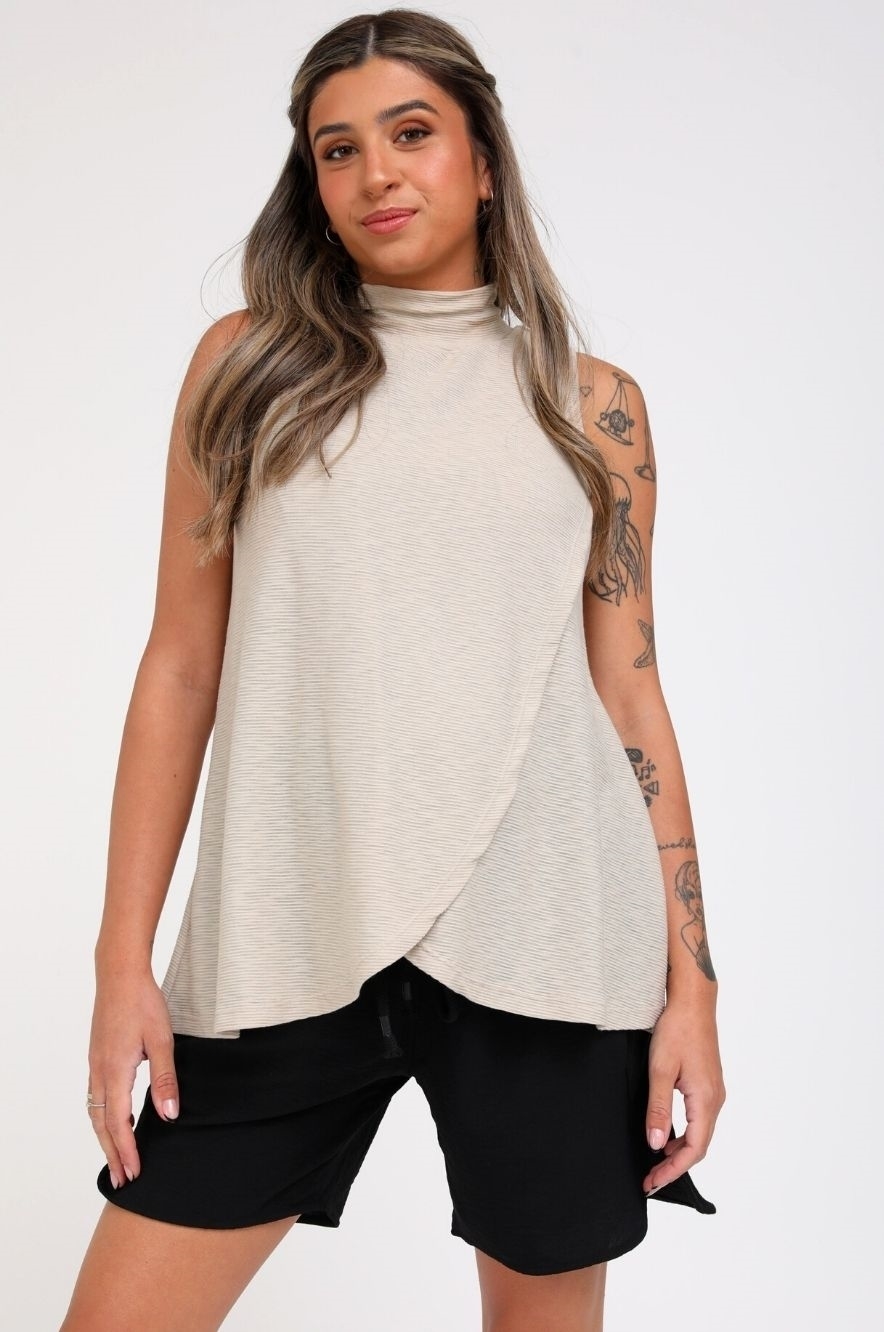 גופיית מעטפת בגזרת A LINE מבד סריג קליל באריגת ריב בשילוב צווארון גולף קצר ומשוחרר. הגופייה שתלווה אותך לאורך ההריון ועד תום תקופת ההנקה.
