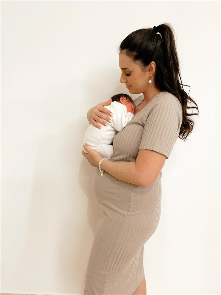 שבוע אחרי הלידה פלוס גידי הקטנטן לובשת שמלת הנקה לילי (מגיעה בעוד צבעים!) ומעיל מלנה.