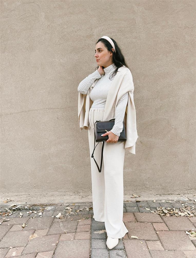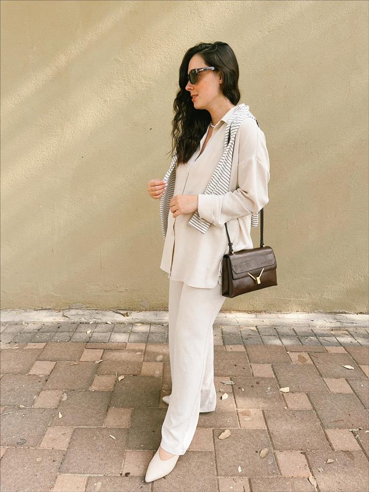 כחודש אחרי הלידה – בחליפה של מכנסי גומי וחולצה גברית בגזרת אוברסייז מעל גולף שמנת עם פס סיכה שחור – מוכנה לפגישת עבודה.
