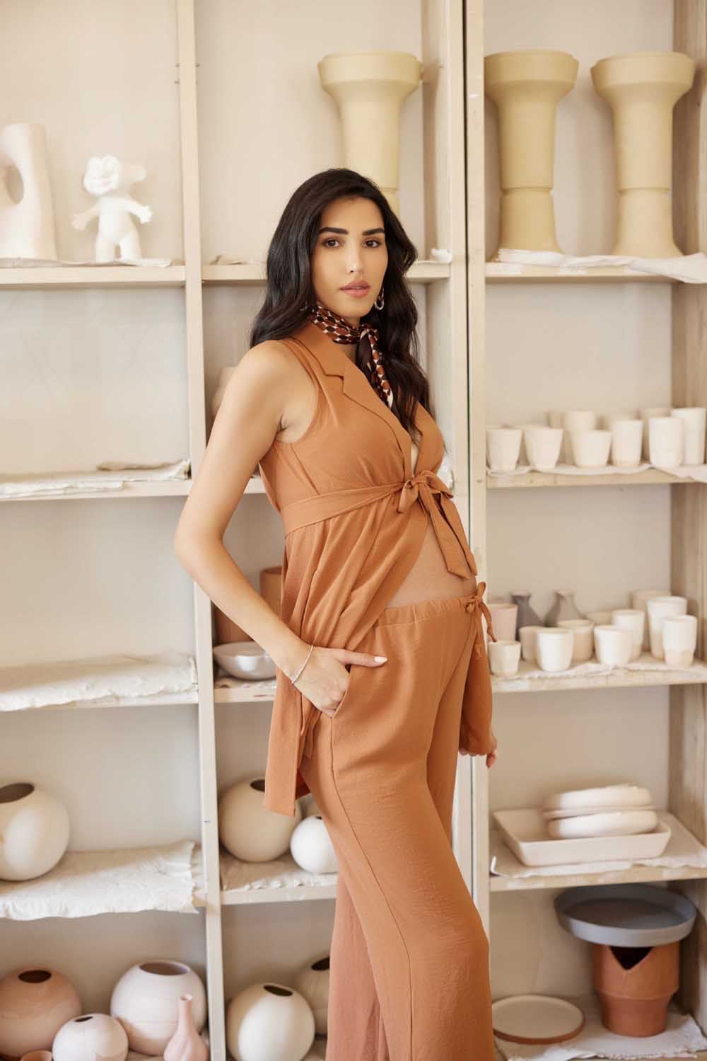ז'קט הריון ללא שרוולים, עם סרט קשירה למראה מחויט וקליל. כל מה שצריך כדי לשדרג את הלוק הבסיסי.