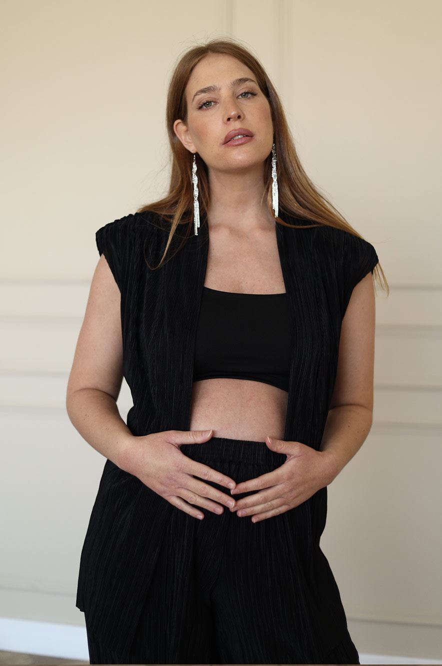 ז'קט הריון ללא שרוולים מבד פליסה מעט מבריק, בשילוב חגורת קשירה מעל הבטן למראה מחויט וקליל.
