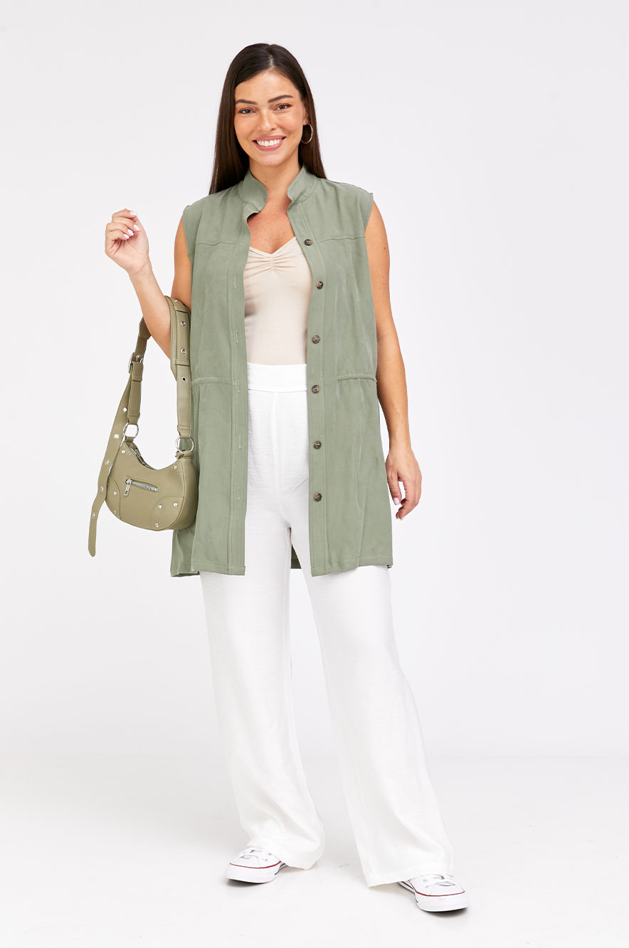 ז'קט הריון ללא שרוולים, עם כפתורים לכל האורך ובשילוב צווארון סיני. הז'קט בעל חוט קשירה המובנה לכל אורך אזור האגן, נותן אפשרות של קשירה פנימית להדגשה וחיטוב המותן. הפתרון המושלם לעונות המעבר, כל מה שצריך כדי לשדרג את הלוק הבסיסי.