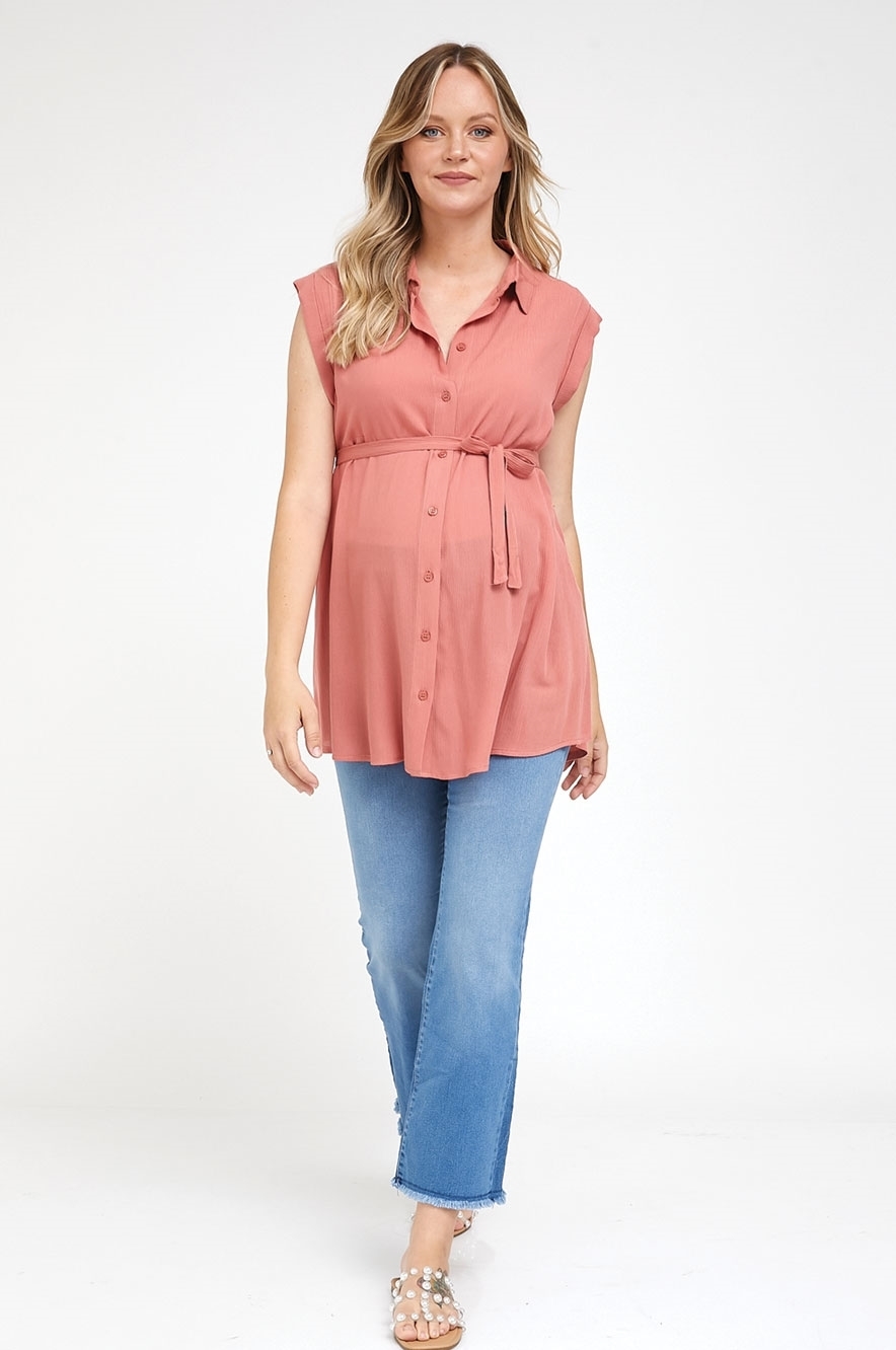 חולצה מחוייטת להריון עם כפתורים לכל האורך, צווארון גברי וחצי שרוול, עם חגורה שניתנת לקשירה מתחת לחזה למראה מחטב.