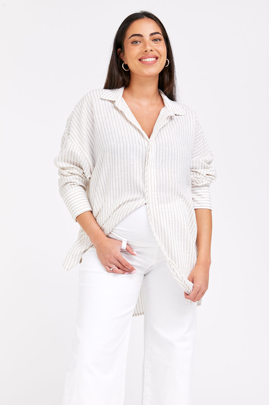 חולצת הריון אוברסייז גברית שמנת פס בז'