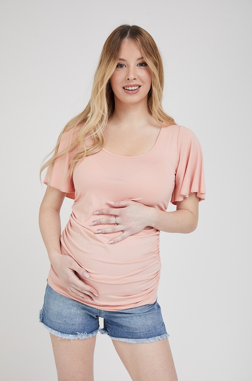 חולצת הבייסיק המושלמת להריון! בטוויסט רומנטי עם שרוולי פעמון, בעלת מחשוף עגול, בד מלטף והמון כיווצים באזור הבטן למראה מחטב ולהתאמה מושלמת לכל אורך ההריון.