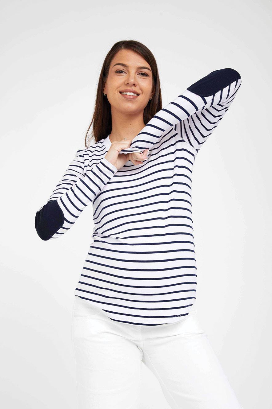 חולצת בסיס להריון קלאסית עם טוויסט מגניב של טלאים במרפקים, מבד נעים ואלסטי שנמתח על הגוף ויעטוף אותך לאורך כל ההריון. הדפס הפסים בשילוב טלאים במרפקים נותנים לחולצה מראה STREET WEAR כיפי ומעניין.