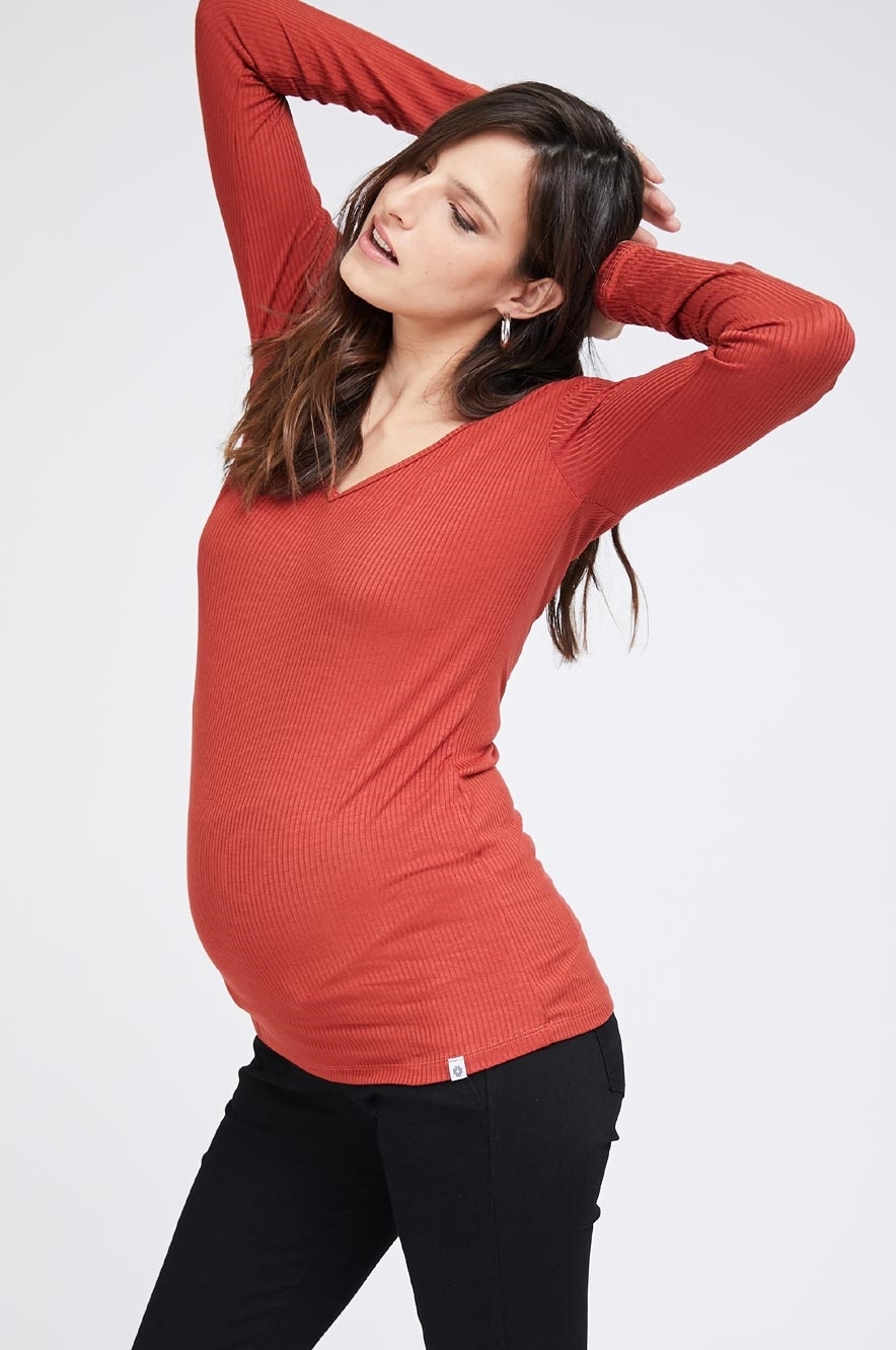 חולצה דקה ונעימה להריון במראה על זמני בגזרה צמודה ומחבקת עם מחשוף V עמוק ומחמיא. חולצה קלאסית להעביר איתה את הימים הנעימים והקרירים של עונת המעבר.