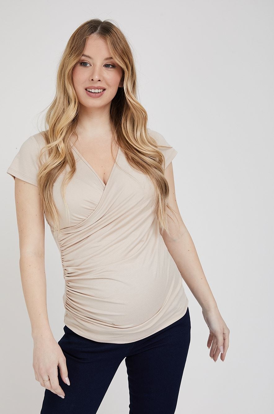 חולצה להריון בעלת מחשוף מעטפה, שרוולים קצרים והרבה כיווצים באזור הבטן, פריט בייסיק מושלם לתקופת ההריון וההנקה.