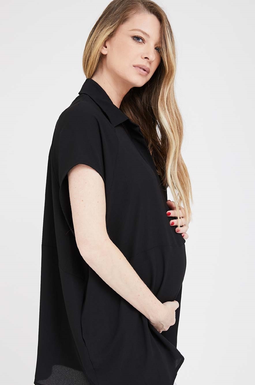 חולצה להריון בגזרת OVER SIZE עם צאוורון מחוייט בשילוב כפתורים קדמיים בחלק העליון וכיסים בצדדים למראה קליל.