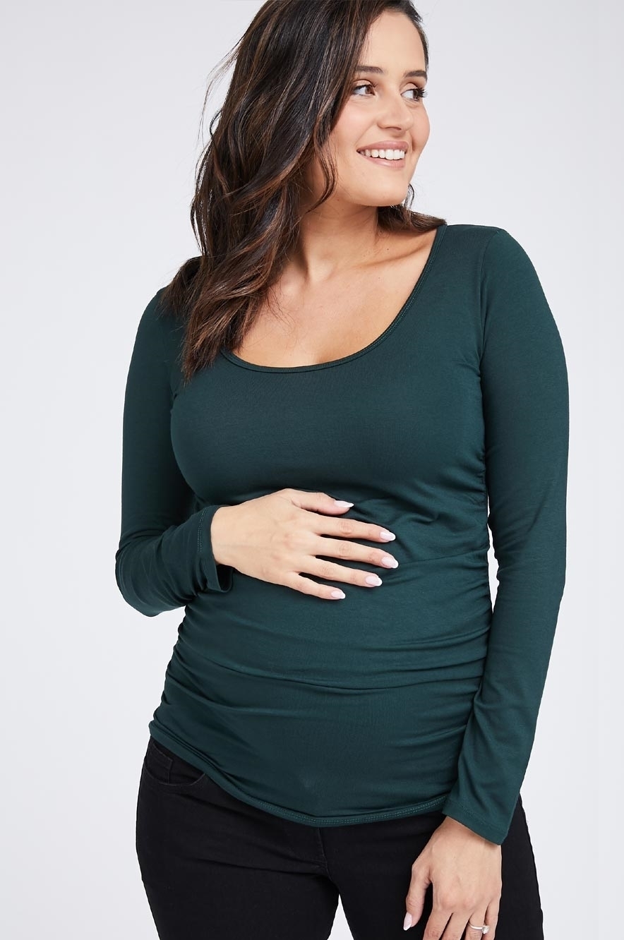 חולצת בסיס להריון עם שרוולים ארוכים, מחשוף עגול והמון כיווצים באזור הבטן, פריט בייסיק מושלם להרכבת מלתחת הריון חכמה. החולצה עשויה מבד נעים שנמתח על הגוף וגזרת הכיווצים שלה משאירה הרבה מקום לבטנך הגדלה, להתאמה מושלמת לתקופת ההריון.
