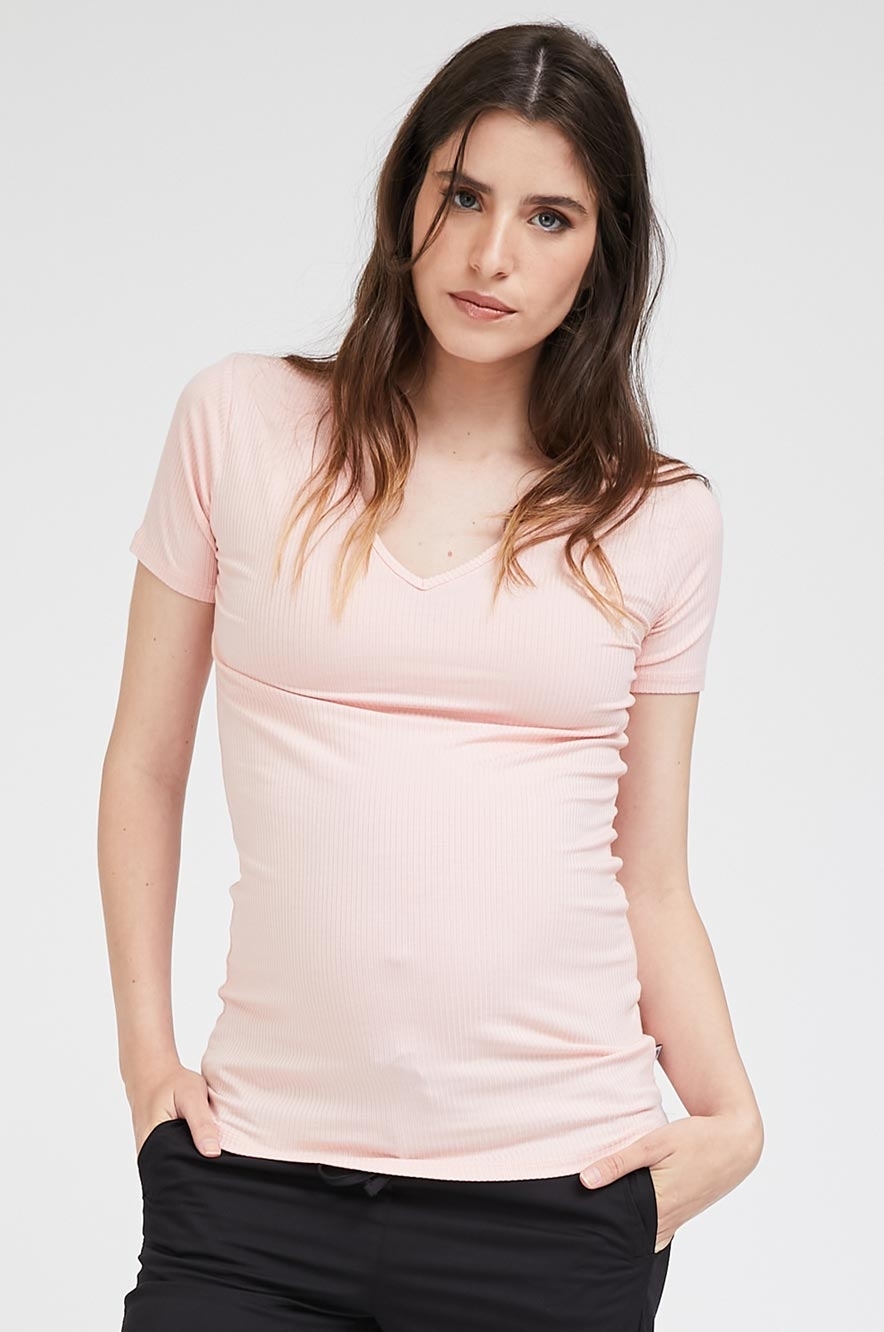 חולצת הריון צמודה מבד רך ונעים בטקסטורת ריב עם מחשוף V קדמי נשי ועדין. פריט בייסיק מושקע שתוכלי לשלב עם כל דבר.