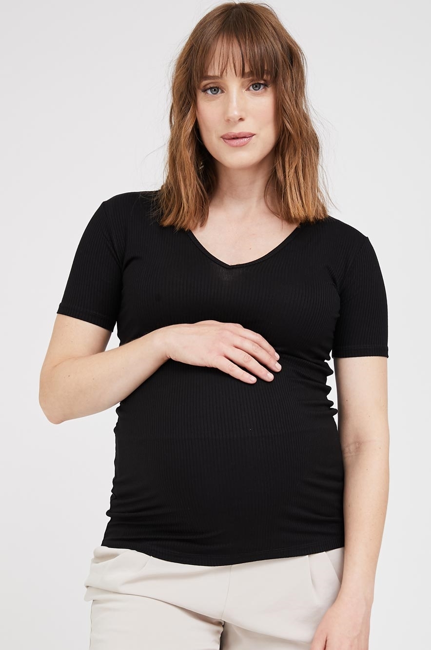 חולצת הריון צמודה מבד רך ונעים בטקסטורת ריב עם מחשוף V קדמי נשי ועדין. פריט בייסיק מושקע שתוכלי לשלב עם כל דבר.