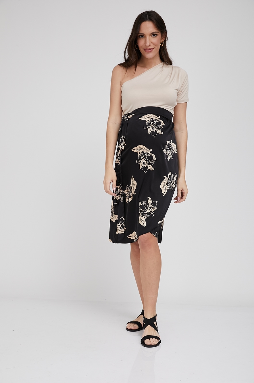 חצאית מעטפת להריון מבד נשפך באורך מידי עם שסע אלכסוני לאורך החצאית וחגורת קשירה שמחמיאה לגזרה. מושלמת ליום יום, לעבודה או לבילוי לילי.