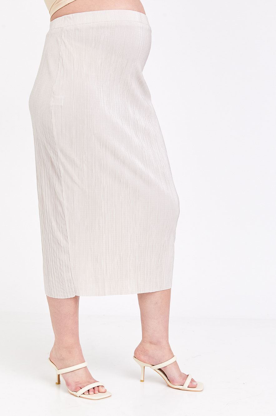 חצאית הריון מבד פליסה, מעט מבריק, קליל ואוורירי בגזרה גבוהה ואופנתית המונחת מעל הבטן עם חגורת גומי, סטייל אלגנטי עם שסע אחורי שמוסיף טוויסט נוסף והופך את החצאית לפריט המושלם לארון שלך!