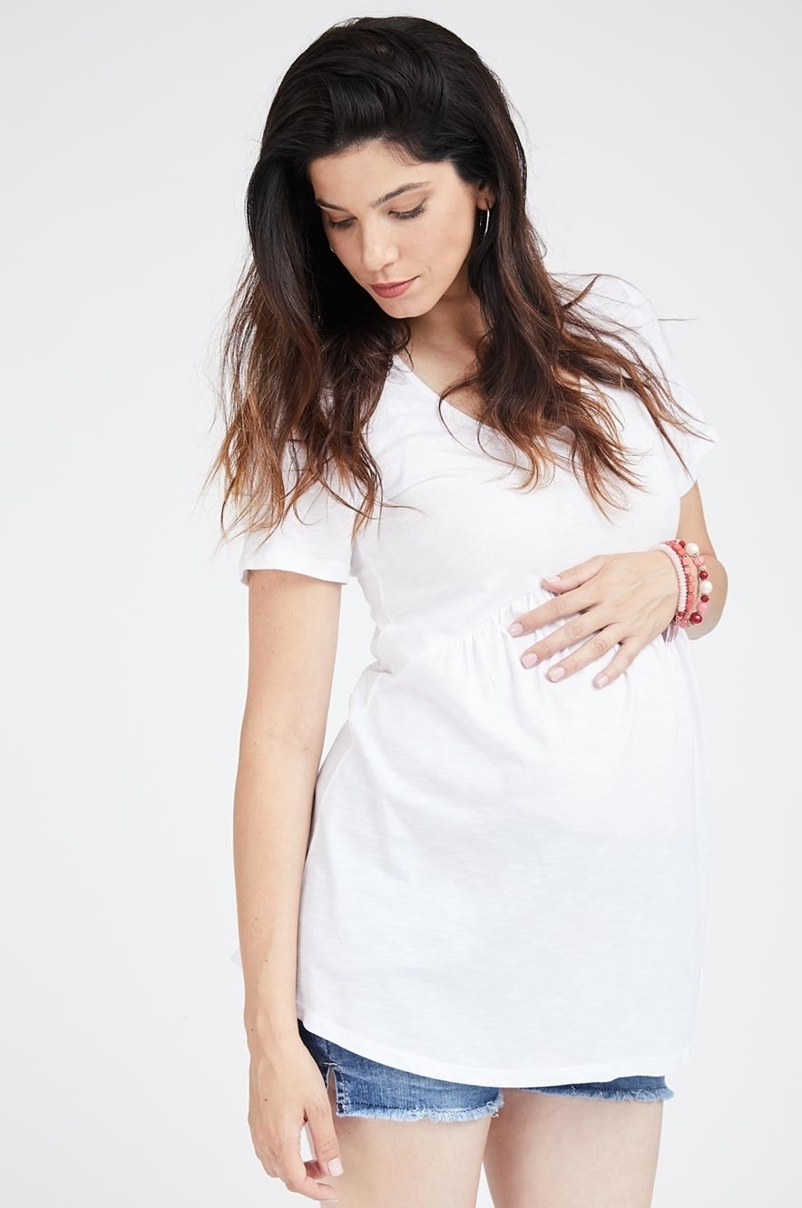 טוניקת T להריון יומיומית וקלילה עשויה 100% כותנה, עם חיתוך מתחת לחזה וכיווצים בגזרה מחמיאה ועוטפת לכל אורך ההריון.
