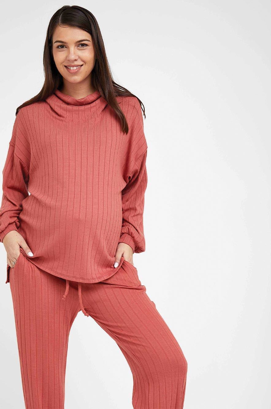 חולצת הריון משוחררת מבד ריב עם צווארון גולף נשפך, שרוולים ארוכים וגומי בסיומת השרוולים.