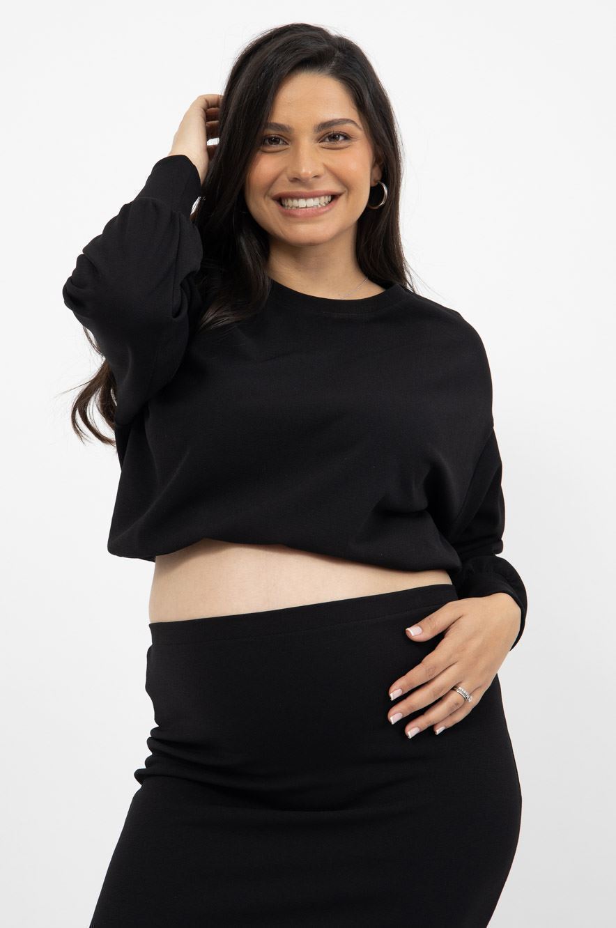 חולצה להריון מבד קרפ לייקרה עבה, חולצת קרופ עם סיומת גומי שיושבת מעל הבטן ההריונית שלך ומדגישה את הגזרה.