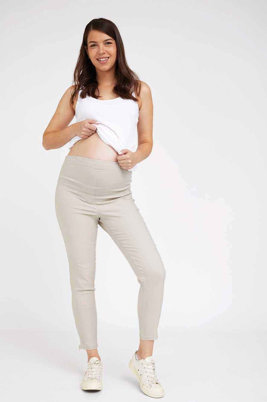 מכנסי סקיני להריון מחוייטים בגזרה גבוהה ומחטבת להריון מבד סופר סטרצ'י בשילוב רוכסנים באזור הקרסול.