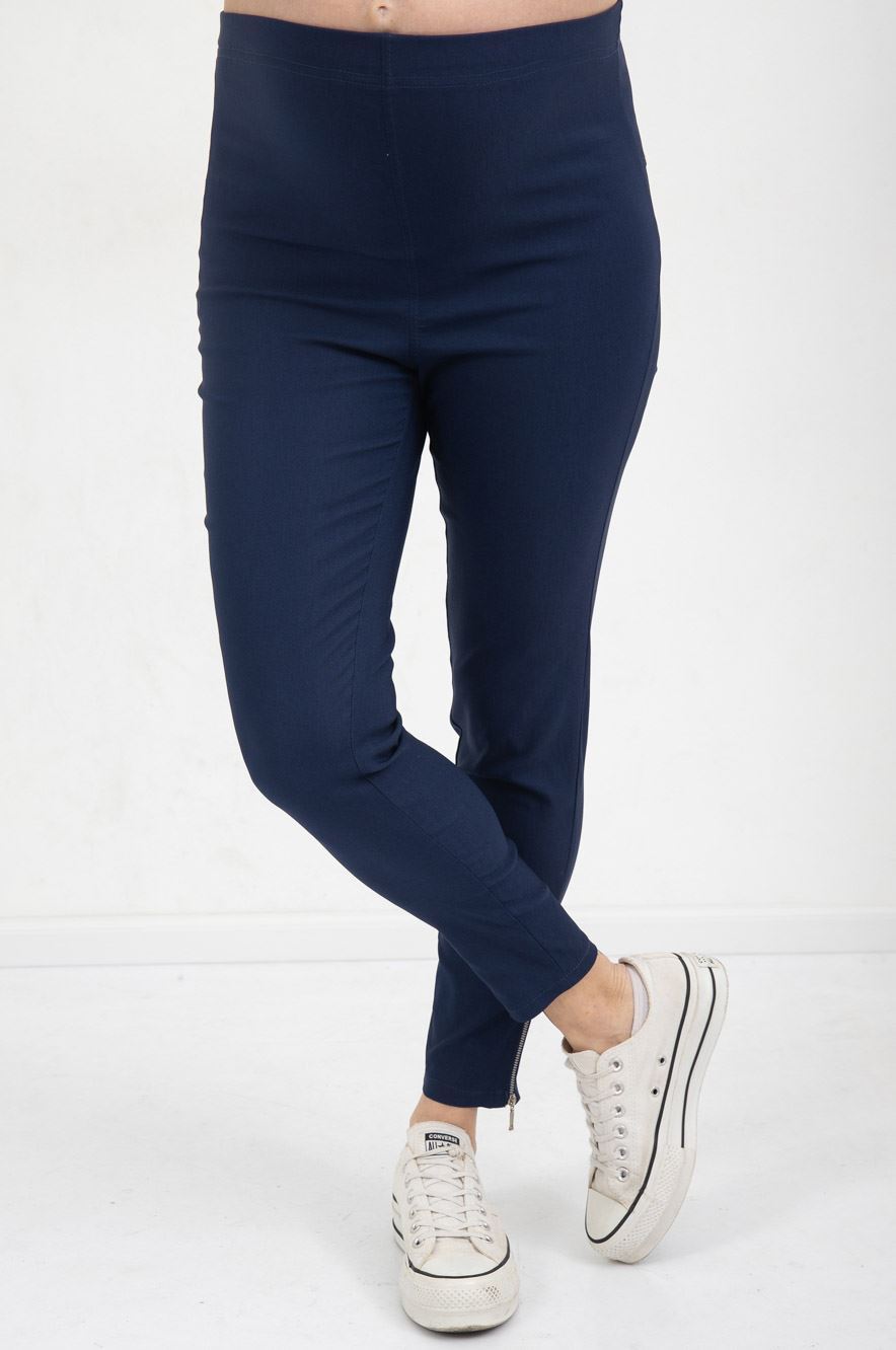 מכנסי סקיני להריון מחוייטים בגזרה גבוהה ומחטבת להריון מבד סופר סטרצ'י בשילוב רוכסנים באזור הקרסול.