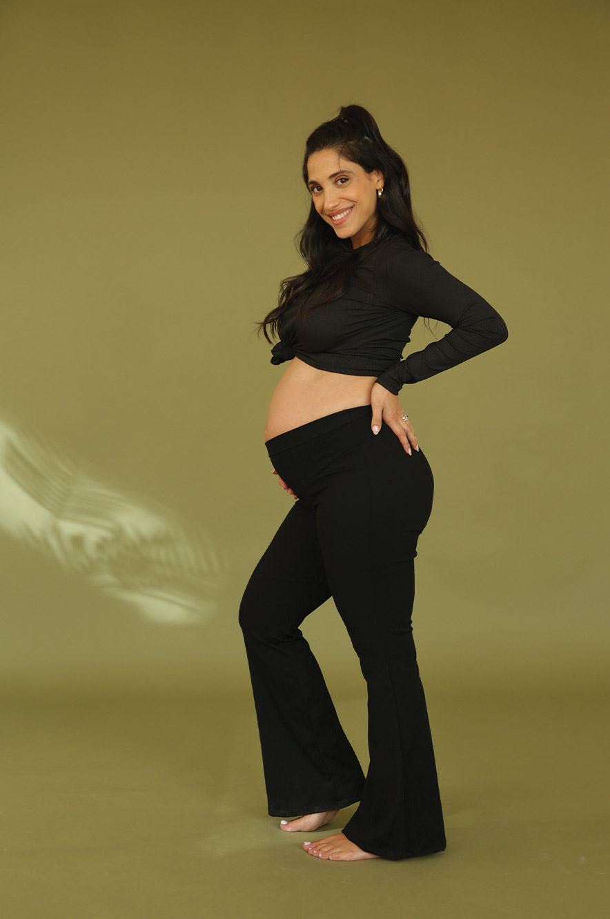 מכנסי הריון בייסיק מבד ריב, צמודים באגן ובירכיים ומתרחבים מהברך ומטה.