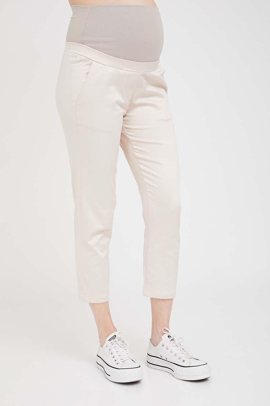 מכנסי הריון מחוייטים בגזרה צמודה ומחמיאה ובאורך קרסול עם שני כיסים קדמיים, עשויים בד סטרץ' נעים ומעט מבריק, עם חגורת גומי מתחת לבטן ורצועת בד רחבה שעוטפת את הבטן, ללא כפתור למראה נקי ותחושה משוחררת.