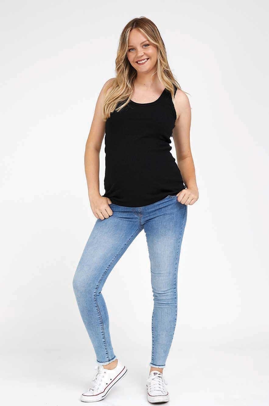 מכנסי הריון סקיני ג'ינס אוליביה, ג'ינס בגזרה גבוהה ומחטבת באורך הקרסול. רצועת הבד הנמתחת מקדימה מאפשרת מתיחה מקסימלית לבטן בשחור דהוי או כחול מושלם. הסקיני האולטימטיבי להריון.