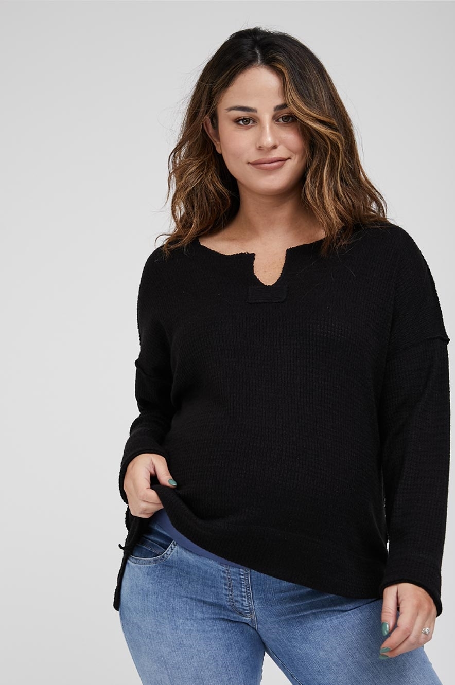 סריג להריון בגימור פיקה, צווארון עגול עם פתח, תפרים חיצוניים (פלטלוק) להדגשת מראה הוינטג'. שרוולים ארוכים ובגזרת אוברסייז למראה STREET WEAR מושלם!