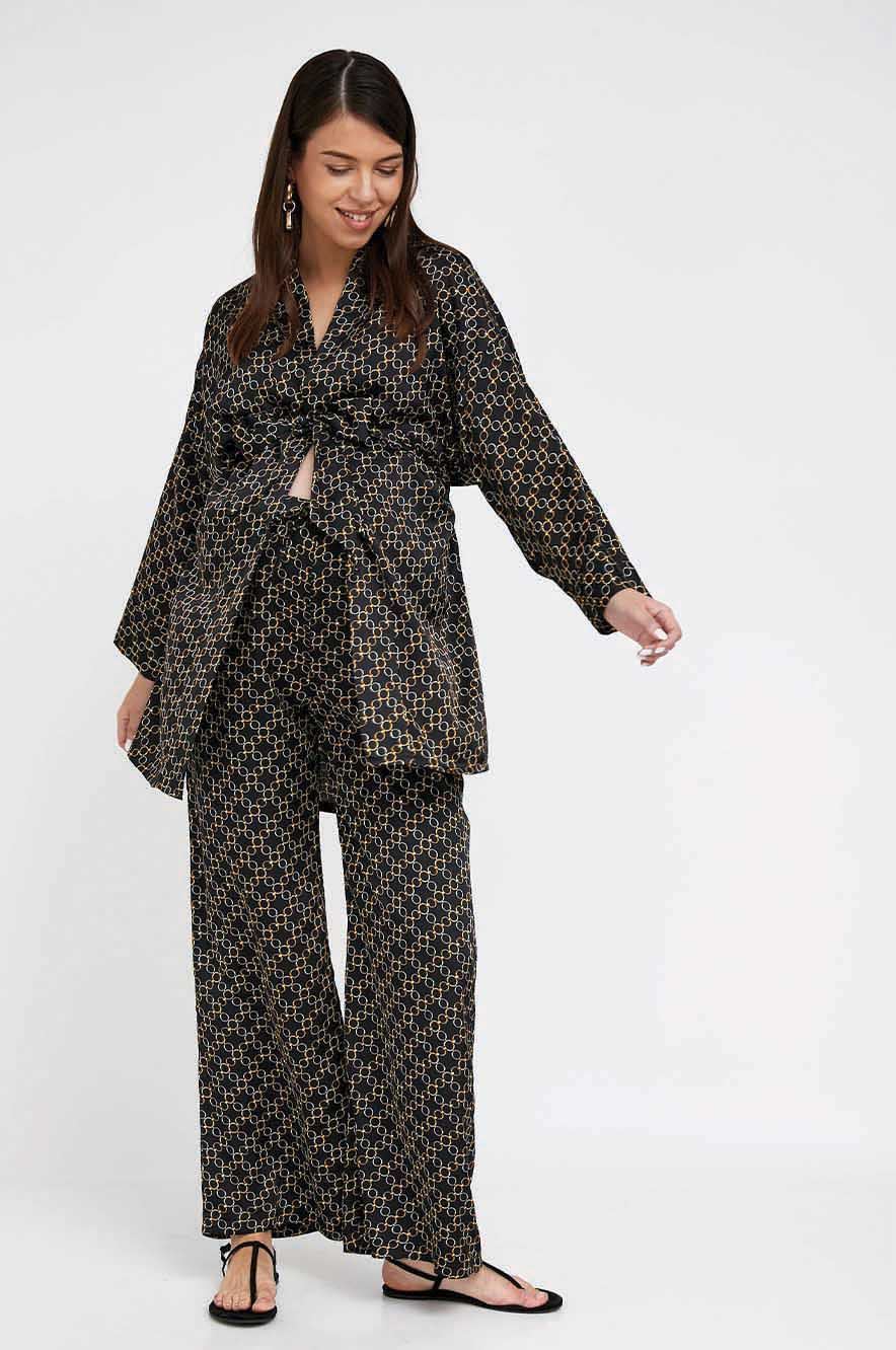 קימונו דמוי סאטן להריון בפרינט טבעות מבד נעים וקליל על הגוף.