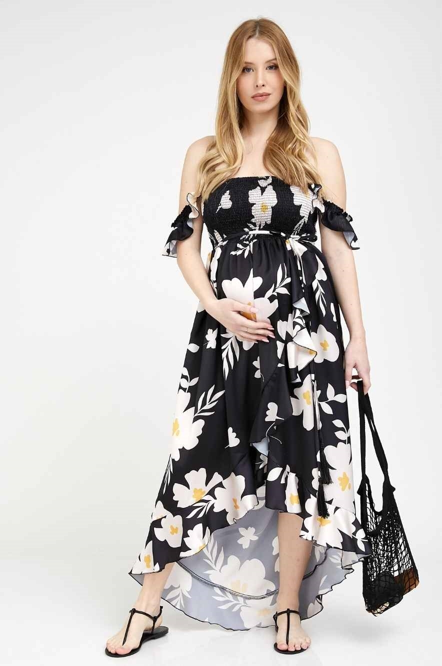 שמלת הריון רומנטית באורך מקסי, בגזרת מעטפת מבד אוורירי ונשפך דמוי סאטן.