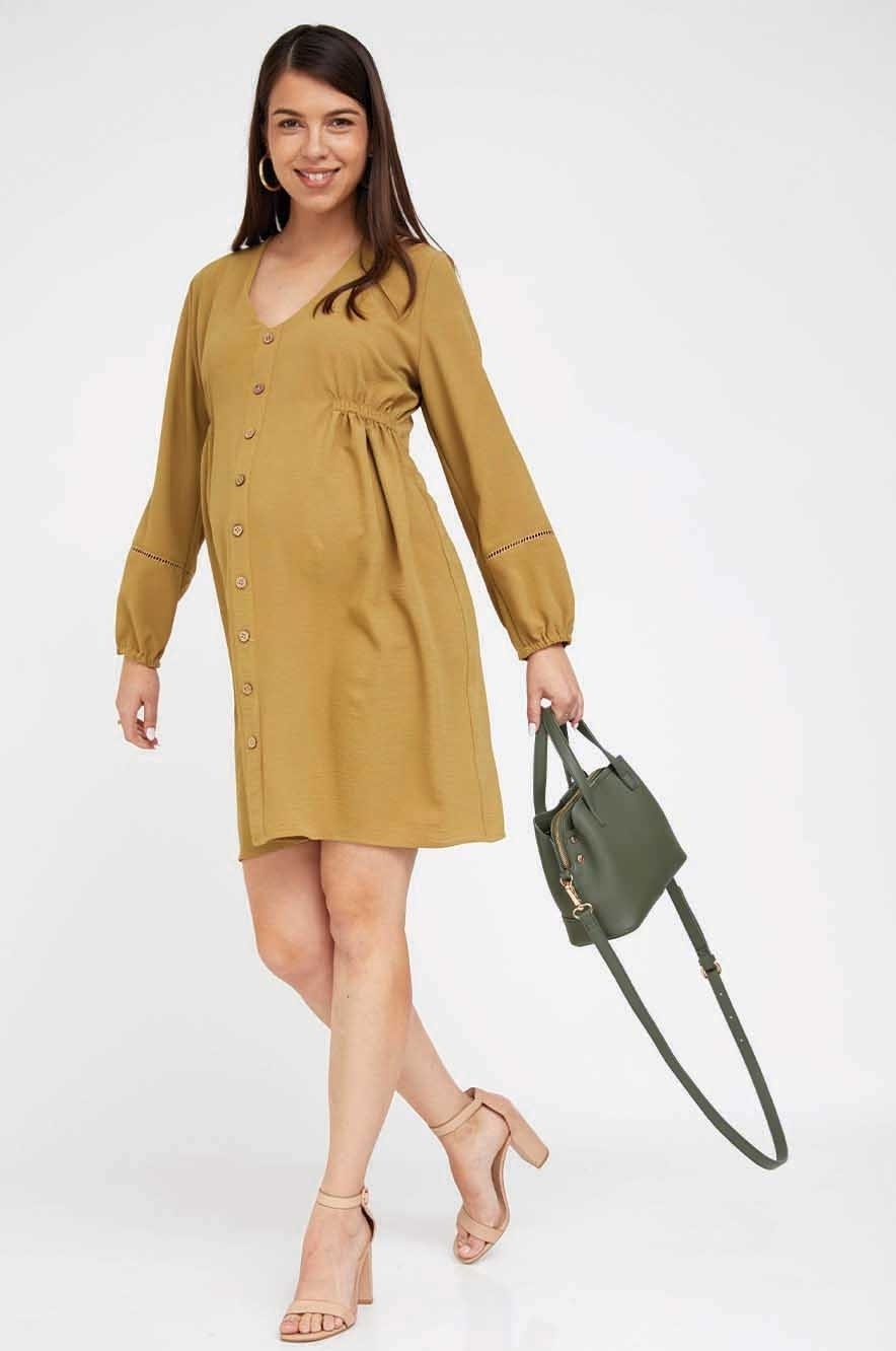 כפתורי דמה לאורך השמלה בשילוב כיווצים מתחת לחזה שמחמיאים לגוף ההריוני.
