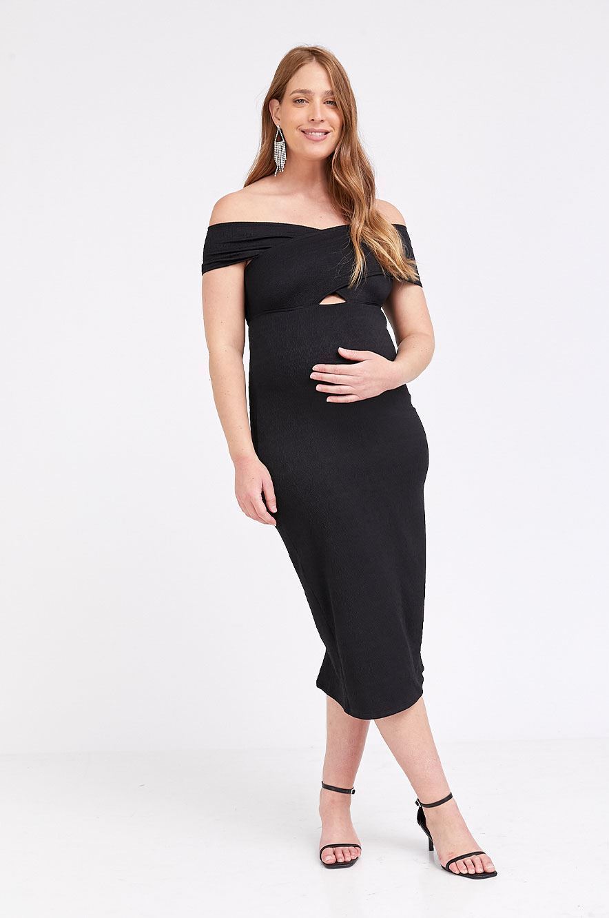 שמלת הריון סקסית, אלגנטית, שתחמיא לכל קימור ולגזרה ההריונית שלך. באורך מידי, מבד סטרצ'י שאוסף ומחטב, בעלת מחשוף מעטפת היוצר פתח בפרונט ושרוולים אוף-שולדרס למראה מחמיא וזוהר,