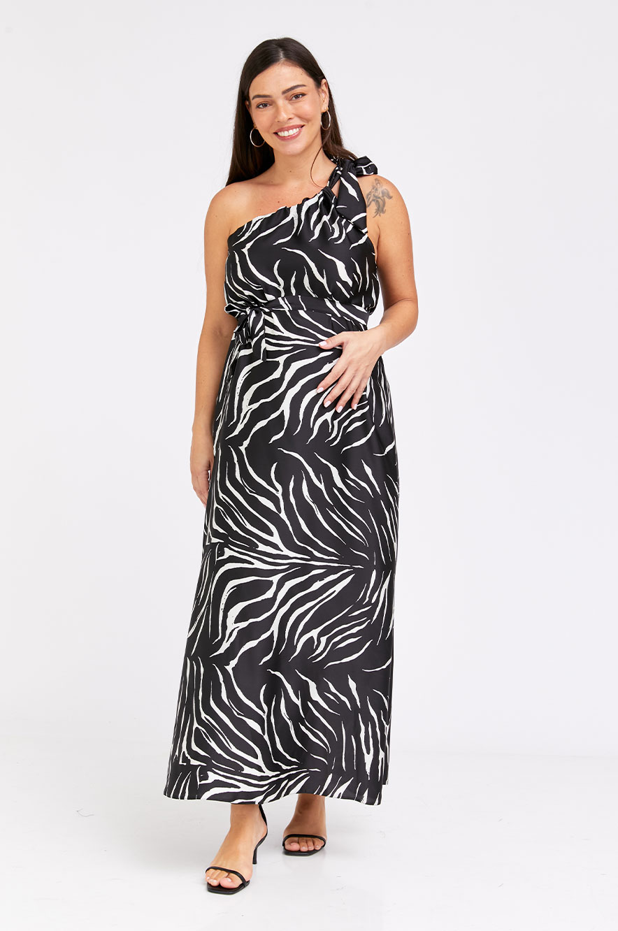 שמלת ערב מקסי אסימטרית ואלגנטית להריון, עשויה מבד מבריק ונעים, בעלת כתפיה אחת נקשרת. השמלה מגיעה בשילוב חגורה להדגשה וחיטוב המותן. בגזרה משחוררת, מדויקת ומחמיאה מעניקה לשמלה זו טאץ' אלגנטי ומרשים אשר הופכת אותה לשמלת ערב מושלמת.