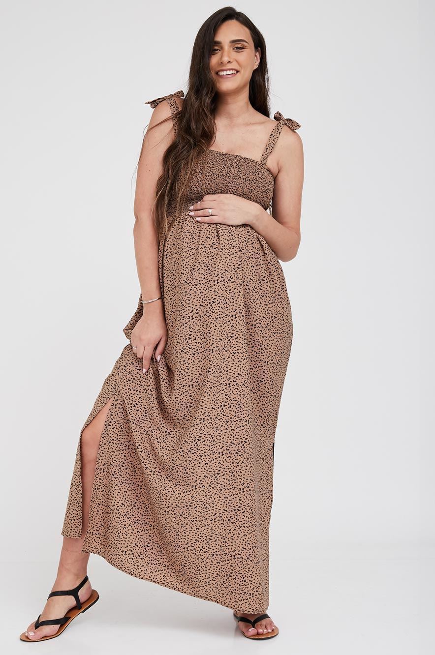 שמלת הריון דמוי סאטן רומנטית באורך מקסי, בגזרה ישרה ושסעים בצדדים.