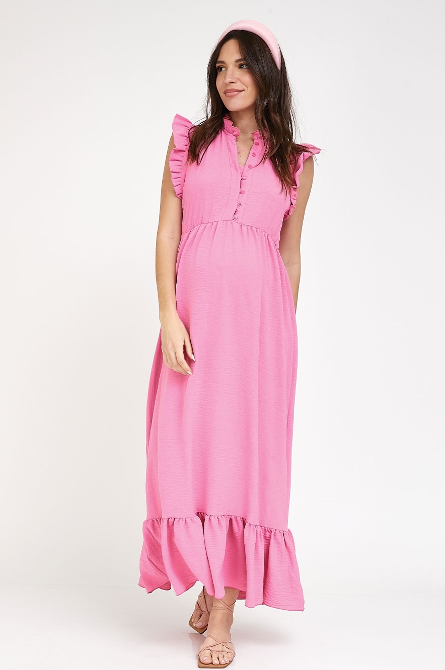 שמלת מקסי להריון בגזרה נינוחה ומשוחררת בצבע ממגנט. שרוולי מלמלה מתנפנפים, צווארון וולן וסיומת פפלום, כפתורים בחלק העליון וגומי מתחת לקו החזה - מדגיש ומחמיא לגזרה הנשית. שמלת הריון סופר שיקית ולא מתאמצת שתלווה אותך לאורך כל ההריון וגם לאחריו.