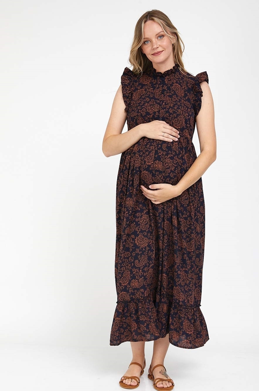 שמלת מקסי להריון בגזרה נינוחה ומשוחררת בהדפס פרחוני. שרוולי מלמלה מתנפנפים, צווארון וולן וסיומת פפלום, כפתורים בחלק העליון וגומי מתחת לקו החזה - מדגיש ומחמיא לגזרה הנשית. שמלת הריון סופר שיקית ולא מתאמצת שתלווה אותך לאורך כל ההריון וגם לאחריו.