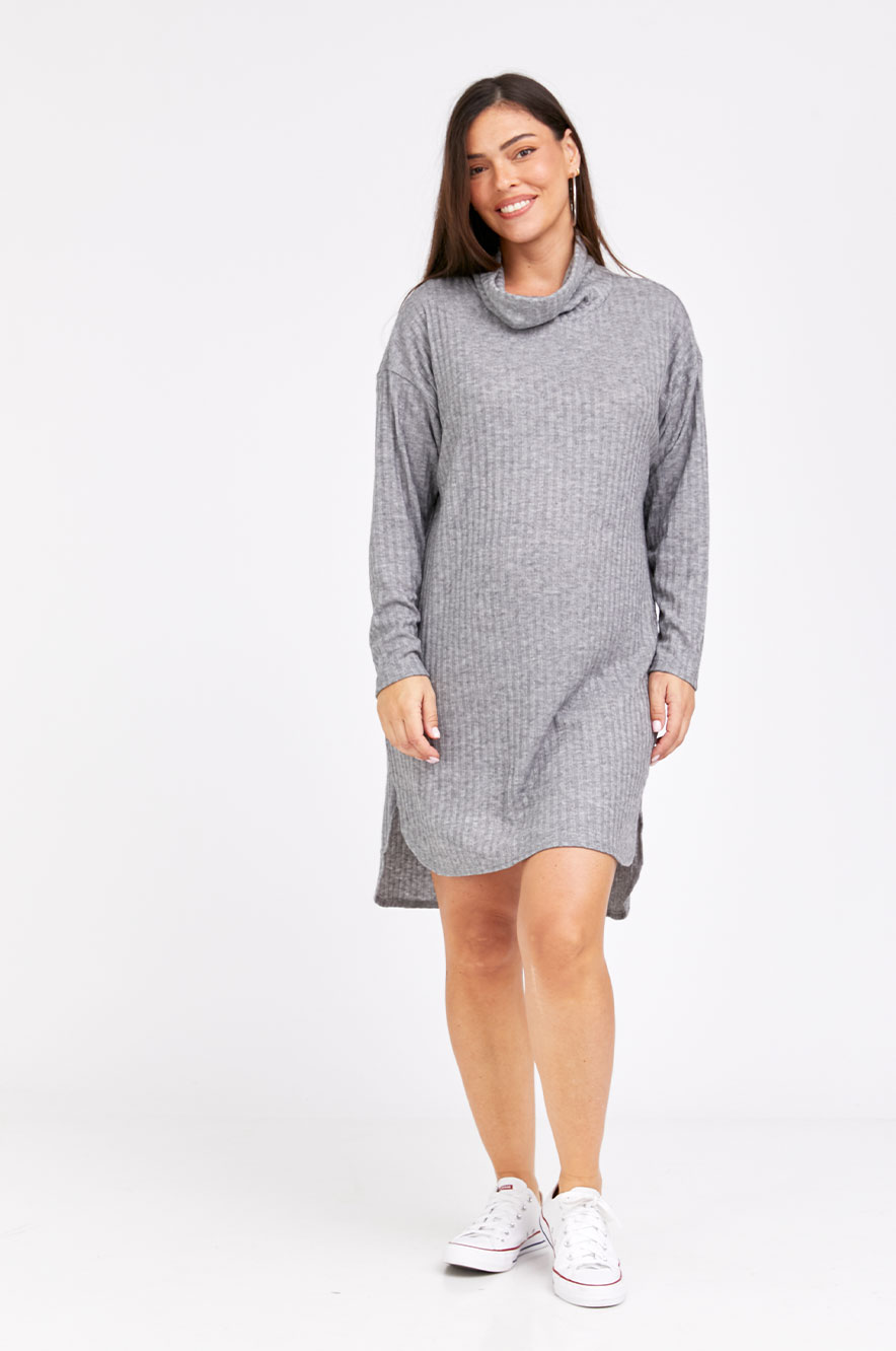 שמלת טוניקה להריון בגזרה משוחררת ונינוחה עם צווארון גולף מבד סריג ריב נעים.