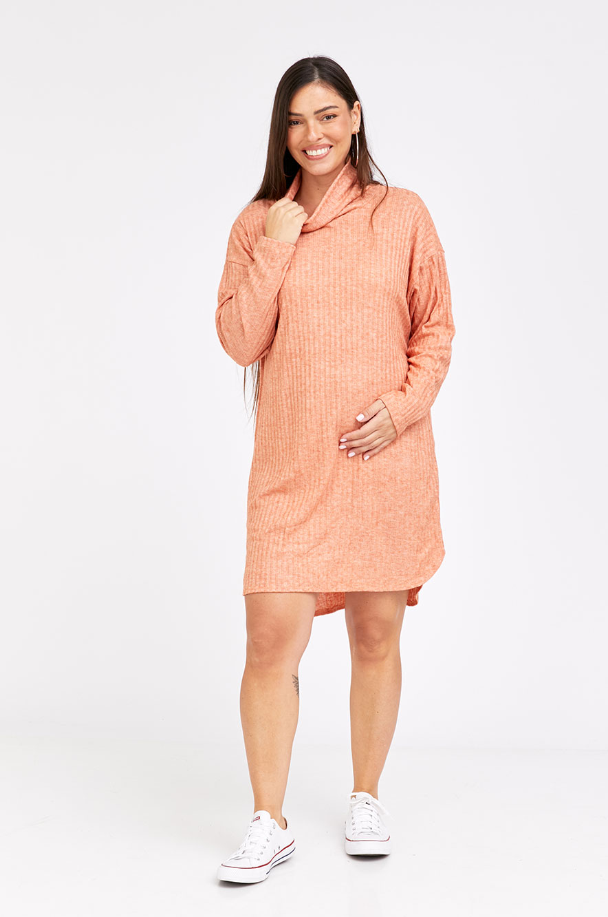 שמלת טוניקה להריון בגזרה משוחררת ונינוחה עם צווארון גולף מבד סריג ריב נעים.