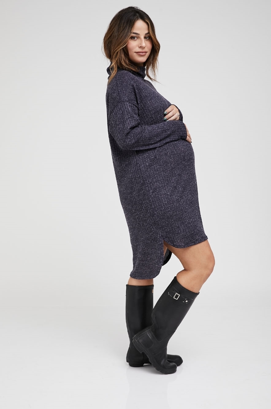 שמלת טוניקה להריון בגזרה משוחררת ונינוחה עם צווארון גולף מבד סריג ריב נעים.