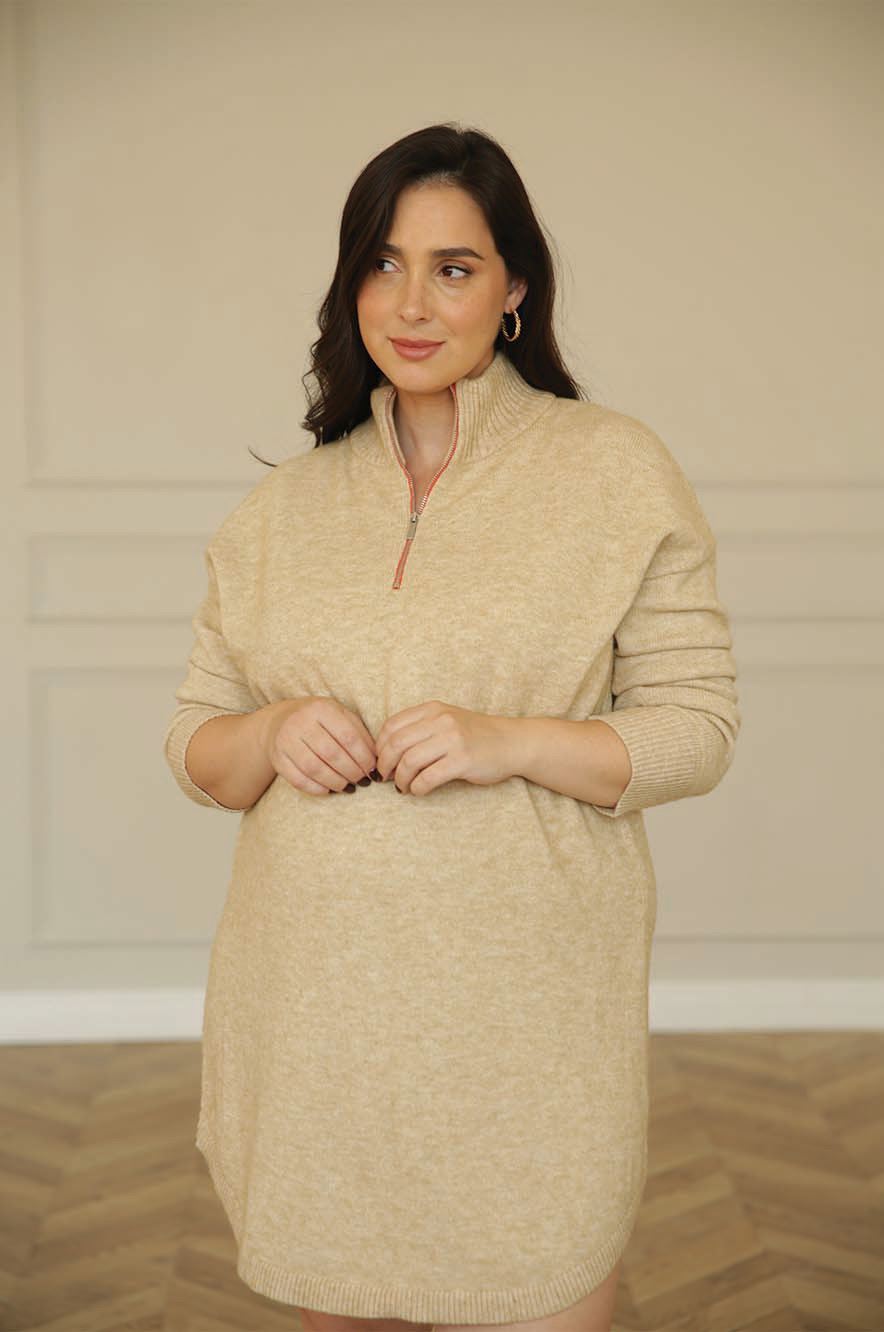 שמלת טוניקה סריג להריון עם צווארון חצי גולף בשילוב רוכסן עם נגיעת צבע שונה, בגזרה משוחררת ונינוחה.