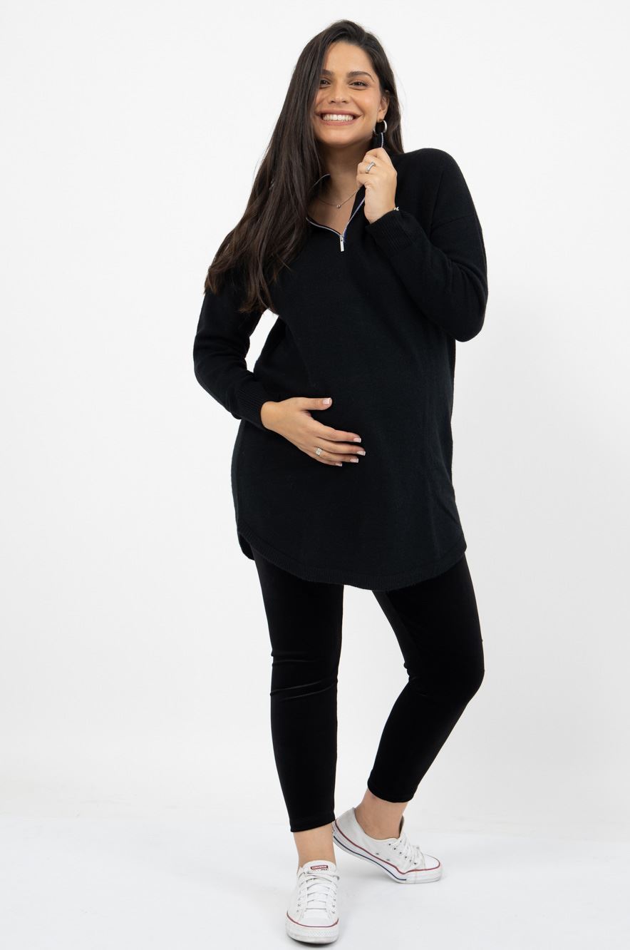 שמלת טוניקה סריג להריון עם צווארון חצי גולף בשילוב רוכסן עם נגיעת צבע שונה, בגזרה משוחררת ונינוחה.