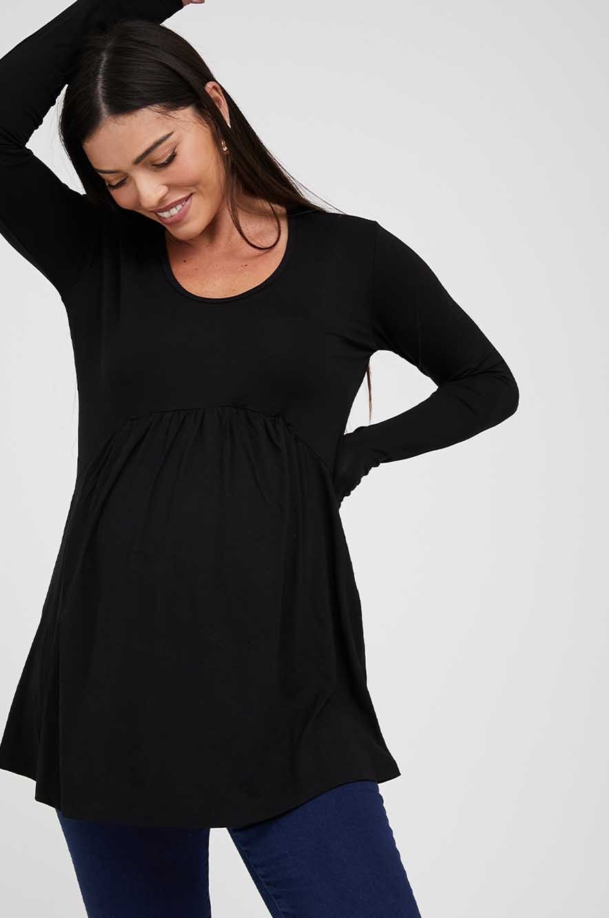 טוניקת T הריון יומיומית וקלילה עם חיתוך מתחת לחזה וכיווצים בגזרה מחמיאה ועוטפת לכל אורך ההריון.